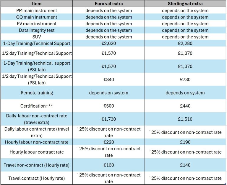 As a guideline to our prices for service work time & travel the table shown has our standard rates in € with VAT extra. Prices for customers in Northern Ireland are given in £ sterling vat extra.